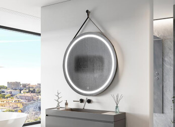 Pyöreä taustavalaistu peili on kiinnitetty nahkahihnaan, joka on saatavissa kolmessa värivaihtoehdossa: musta, vaaleanruskea ja tummanruskea. Personointioption avulla voit säätää peilin omien mieltymystesi ja sisustustyylisi mukaisesti. Tyylikäs aitoa nahkaa oleva hihna.